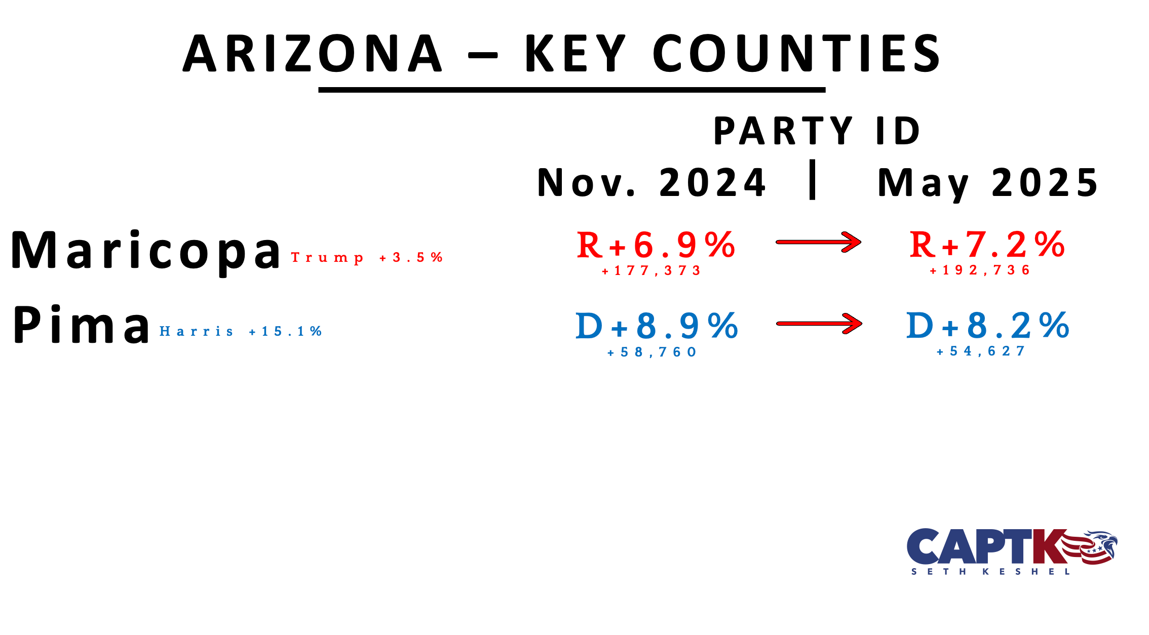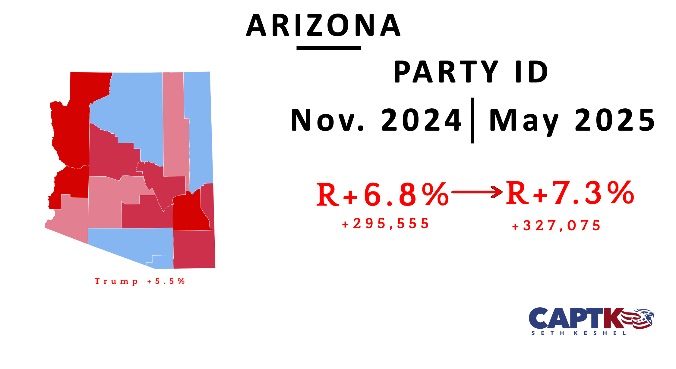 I don’t need to wait for periodic Secretary of State updates to update Arizona’s file because I monitor the dashboards operated by Maricopa and Pima Counties to plug shifts in real time. Republicans are now out to a lead of +327,075, or 10.7% stronger than when Trump won Arizona comfortably six months ago. If the Maricopa Board of Supervisors ever got the hell out of the way and allowed Maricopa Recorder Justin Heap to do his job, Arizona would turn into a Florida-style R+9 state by midterms.