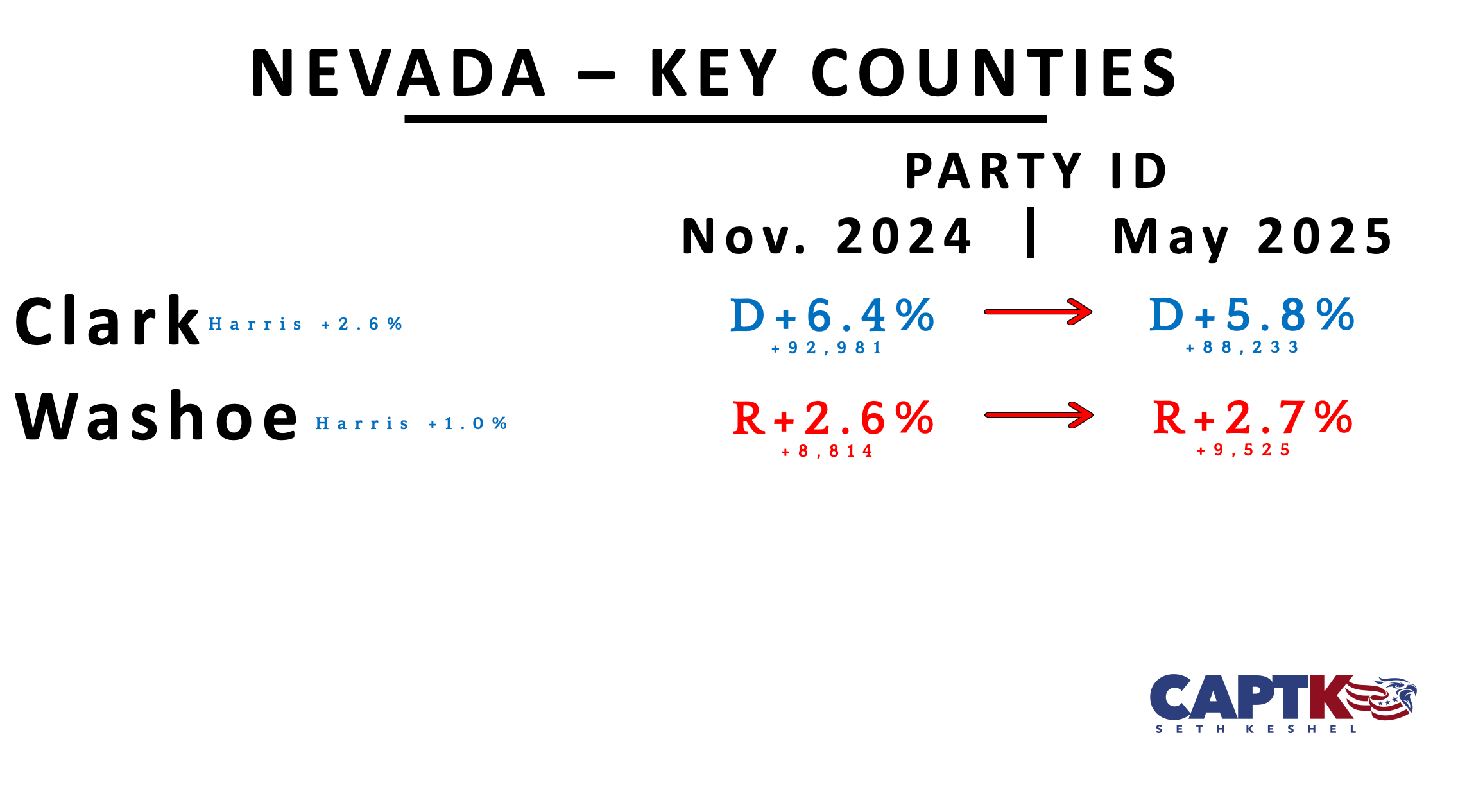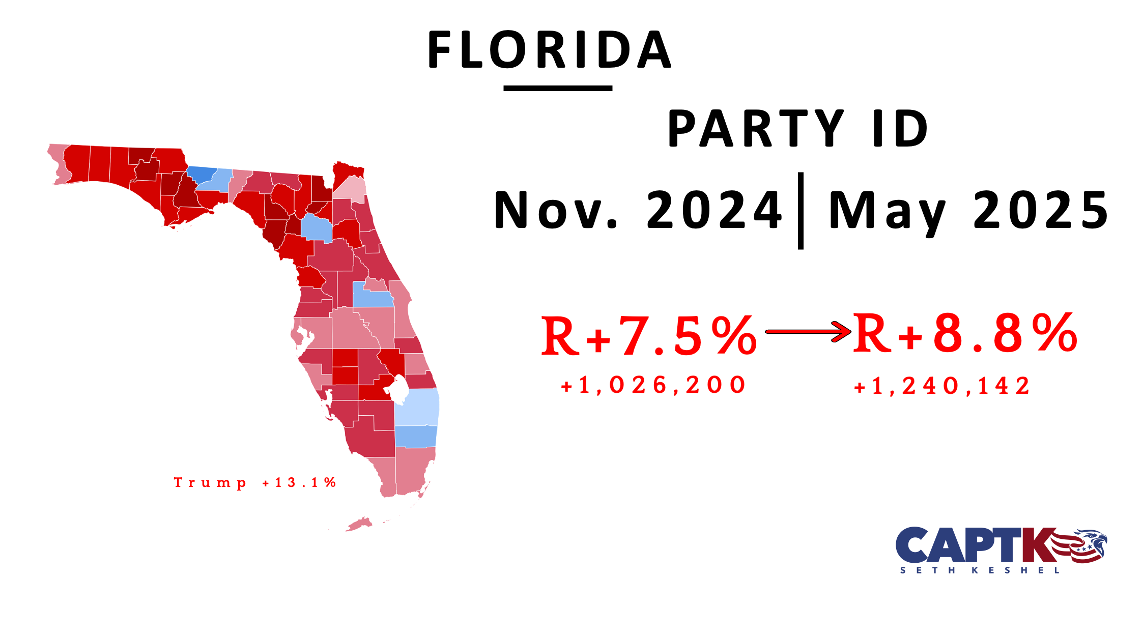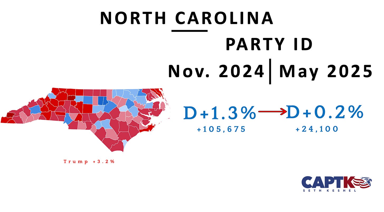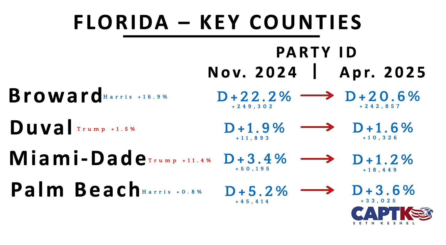 Voter roll maintenance cuts registrations of both parties, but incredibly, Florida surges ahead, nearing R+9 overall. Duval County, the Georgia bellwether, continues to inch rightward in a positive sign. Miami-Dade and Palm Beach Counties continue on trajectory to have Republican registration advantages by the 2028 election.