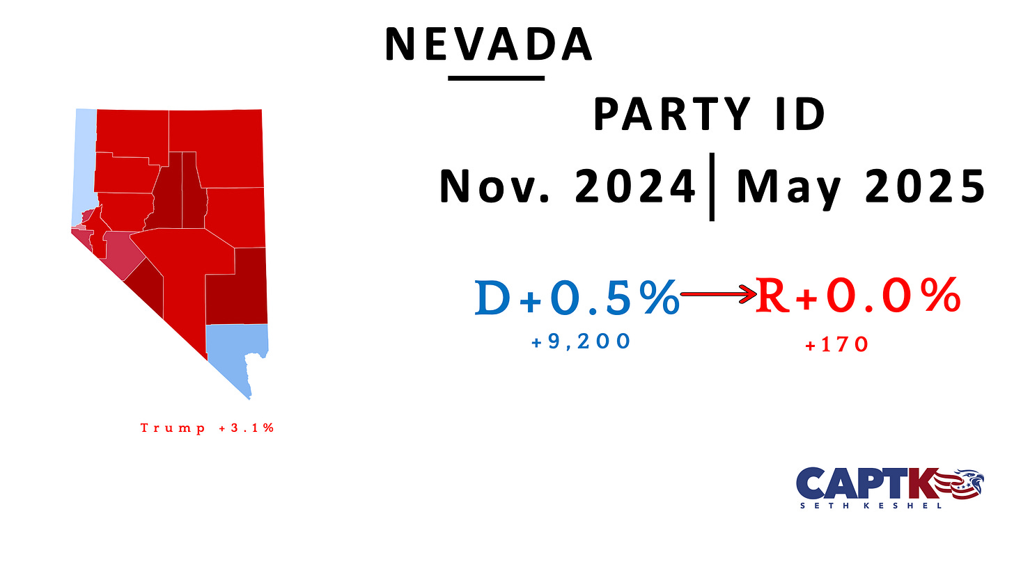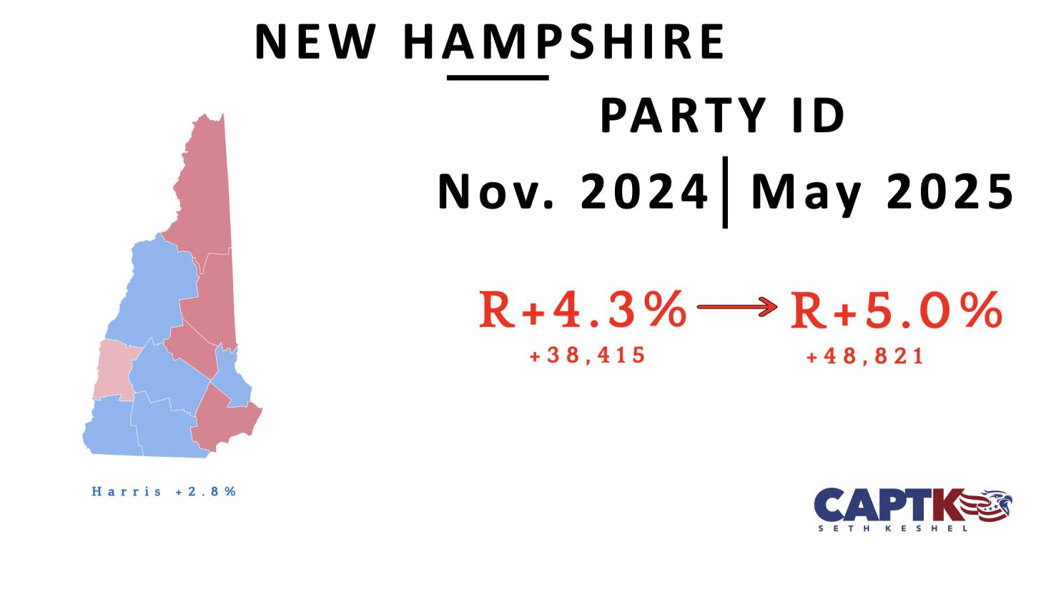 New Hampshire finally cranked out an update to its voter registration file, and it’s another net pickup for the GOP, pushing the state to an even R+5. This will need to continue for the 2028 GOP nominee to pick up the state’s four electoral votes because the independent vote here skews heavily left. This shift signifies not only GOP consolidation of the white working-class vote, but stability with more affluent suburban voters.