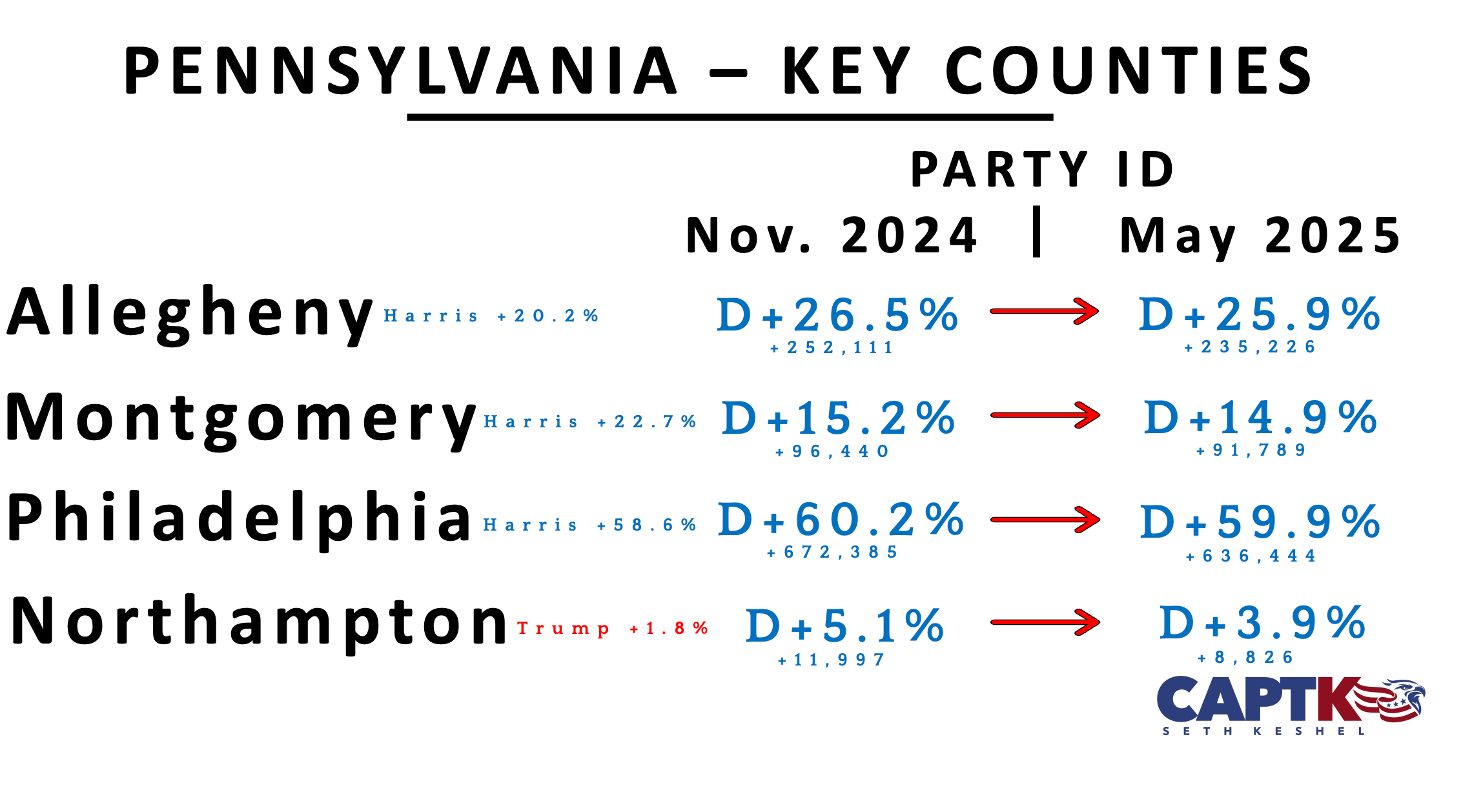 For the first time in recent memory, Pennsylvania took a step, albeit a minuscule one, to the left for a one-month change as Democrats outpaced Republicans in three weekly updates for April. I have no concern about this being a lasting shift, and wrote up the why last week to calm any nerves. This shift is primarily driven by heavy registration drives in the Philadelphia and Pittsburgh metro areas, and should abate now that municipal primaries are over. Despite the temporary setback, Republicans gained in 46 of 67 counties last week.