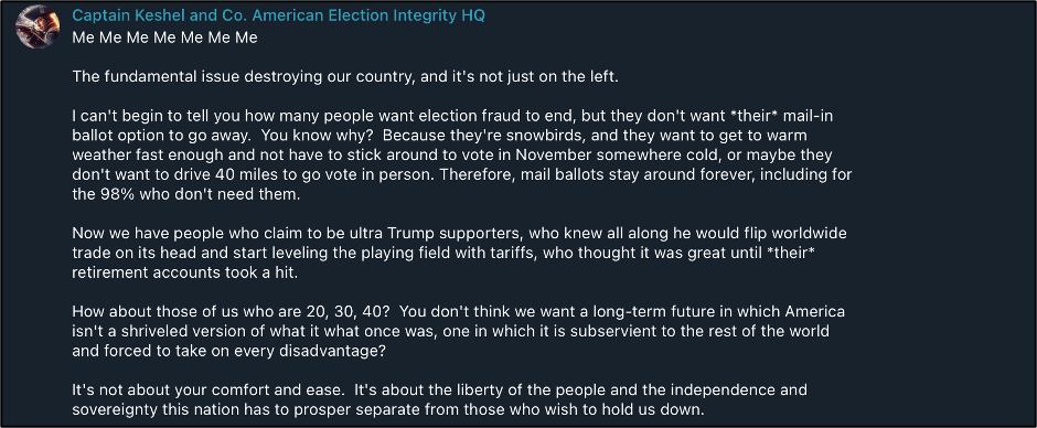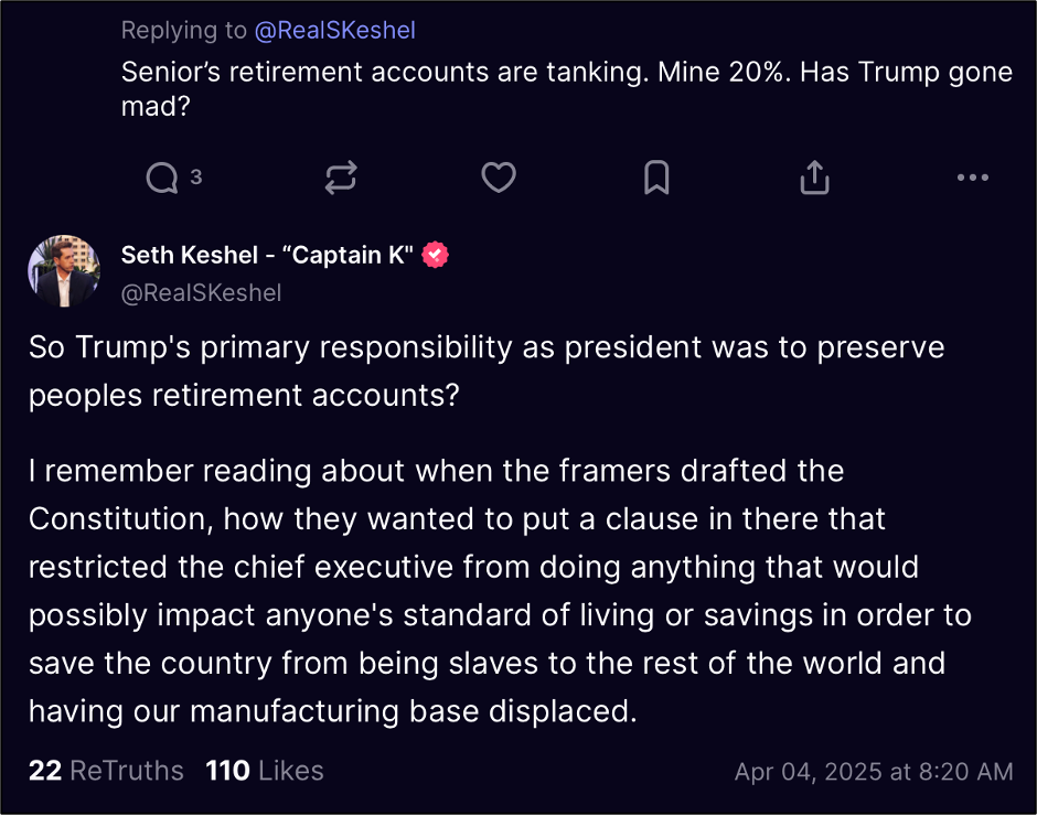 The same person responded to my post, telling me I’m being insensitive and that they voted for Trump, registered voters for him, and were his biggest supporters - and they didn’t deserve their portfolio tanking in exchange for their support of him. This prompted a blanket post about the big picture, which I posted on Telegram and Truth Social.