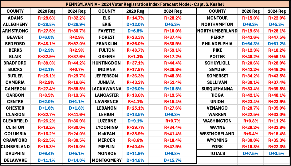 I posted the status of Pennsylvania voter registration by party last night, showing the change from 2020 in all 67 counties, showing 63 shifted to the Republican right since the 2020 election: