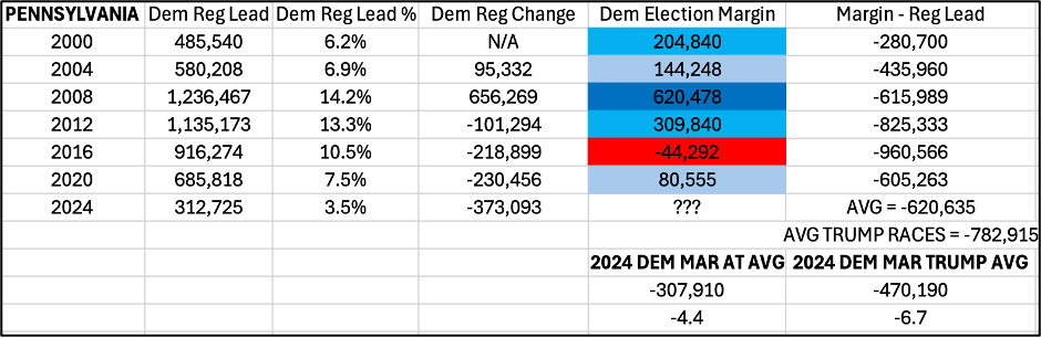 Here is a readout since 2000 on how Pennsylvania’s results line up with the voter registration index: