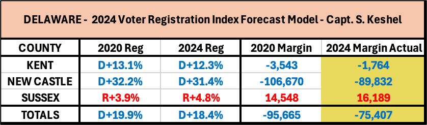 · All three counties in Delaware reflected a shift in registrations toward the GOP. New Castle and Kent Counties turned out more favorably for Trump in losing margins than in 2020, but Sussex County, the most conservative county in the state, was won by Trump by a smaller percentage, though by a modest increase in raw vote margin. The party registration indicator was 2 for 3 in Delaware by percentage margin. I will dig deeper into Sussex County further down in this entry.
