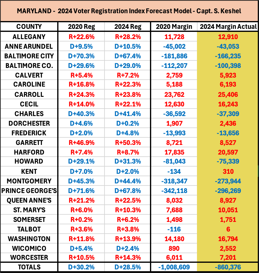 · Maryland from D+30.2% in 2020 to D+28.5% in 2024