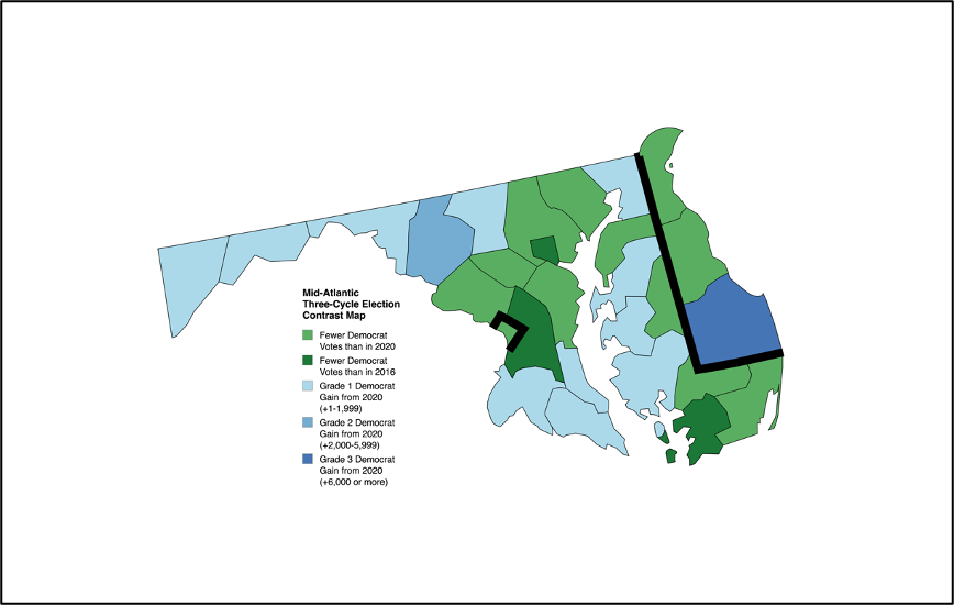 Both Delaware and Maryland were substantially bloated by the 2020 COVID protocols, as you will see further down in this entry. Additionally, Delaware is Joe Biden’s home state and has a bit of the home field advantage wrapped around its 2020 figures. Interestingly, I did not mark Washington, D.C., as suspect for the 2020 election seeing that its Democrat gains were minimal, and the margin of defeat was slightly less severe for Trump than it was in 2016. This year, I did not foresee Trump carrying any of the 16 electoral votes up for grabs, but thought there may be outside chance of getting Delaware inside double digits. Larry Hogan, the imposter Republican and former governor of Maryland, ran for U.S. Senate in what was perhaps the only significant race people were watching (and notably, the race Senate GOP bureaucrats diverted funds to instead of backing candidates who could have won elsewhere).