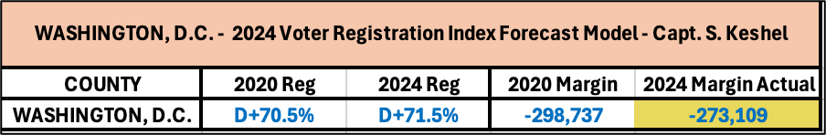· Washington, D.C., from D+70.5% in 2020 to D+71.0% in 2024