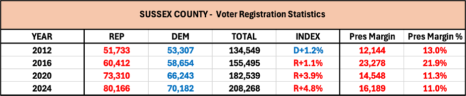 · Sussex County, Delaware – presidential margins, particularly for the last two elections considering consistent population growth, Republican Party registration edge continuing to build, and the absence of home-state Joe Biden on the 2024 ticket.