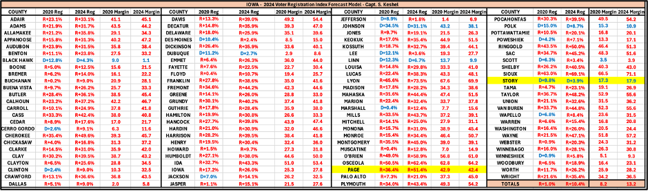 In fact, current margins in southwest Wisconsin closely parallel Iowa’s 2024 results, which were overwhelmingly predictable by voter registration by party: