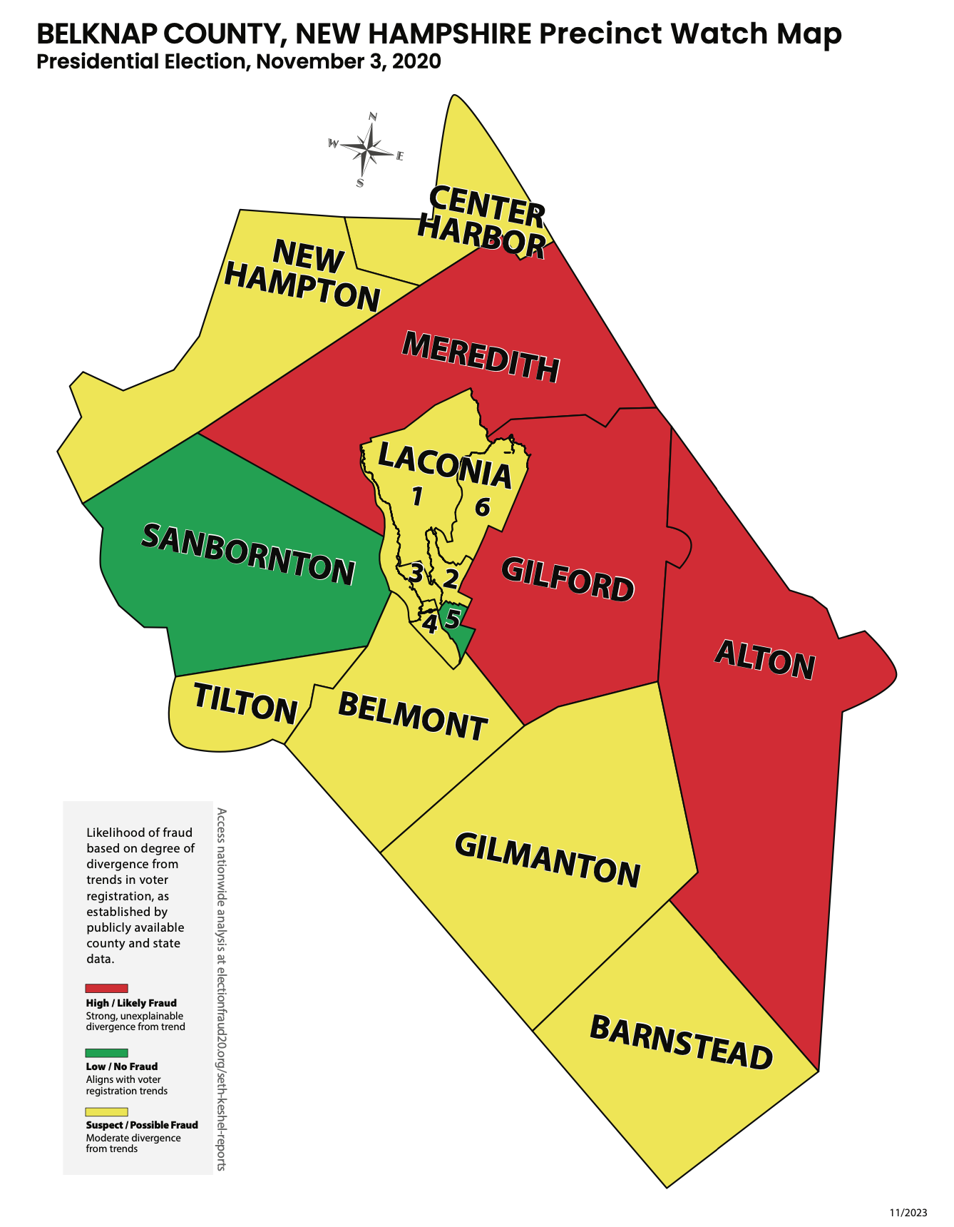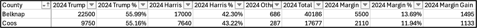 Belknap and Coos Counties are likely to boost Trump by a total of 2,628, if (and that’s a big if) Harris slightly improves on Biden’s vote tallies and Trump maintains an average three-cycle growth rate.