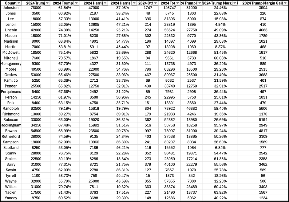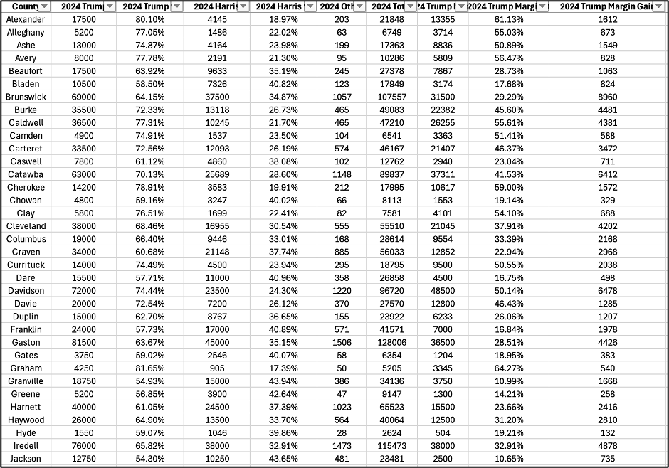 70% of counties fit the Crimson mold in North Carolina, and I expect Trump to win them all by more than he did in 2020, even accounting for ballot stuffing. Biden’s total is Harris’s lid in most of these counties, and Lenoir County at Trump +4.8% is the closest in this model. In reality, it will be difficult for Harris to reach the lid in most of these (something to watch for), and I’ve stated Trump’s likely gains conservatively here, and in all other counties.