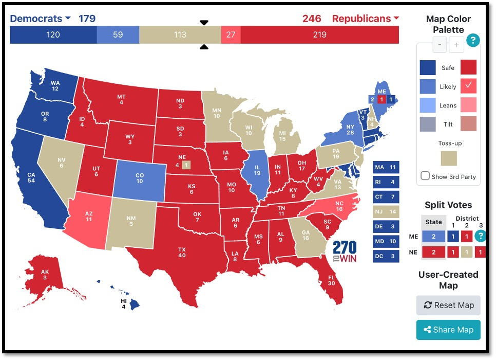 The score after the safe and leaner states is 246 to 179 for Vance. Any person with a basic knowledge of presidential elections should be able to peg these 45 races.