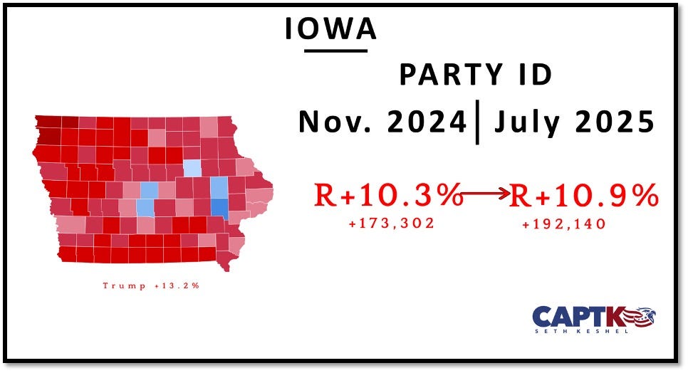 Iowa, after voter roll maintenance, has also continued its GOP registration progression, and will remain in blowout territory, likely coming to resemble Missouri if this pace keeps up. As you read on you’ll see the importance of this sustained trend: