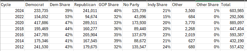 First and foremost, the Democrats have lost more than 203,000 active registrations, including many to a voter roll purge that also clipped Republicans, but at a much-reduced rate. The result has been a major shift toward the GOP, with the state moving from R+1.0% in active registrations to R+10.3% today. You can see the final numbers here and represented in the below chart I made last month that captures the gist of what I’m getting across to you right now: