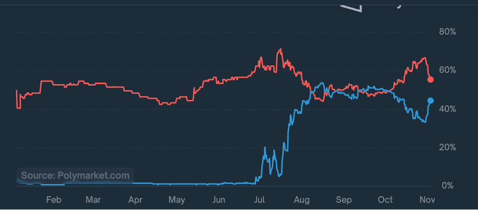 Polymarket’s presidential winner market has pulled close again, with Trump down from the 66.9% favorite three days ago, to up just 10 percent right now. Of course, this presents a buying opportunity for Trump, but narrative matters in modern elections. It is Trump who has commanded the narrative around this election for the entire year, and finding enough ballots to pull this election off in the eyes of the public will require a reversal of narrative favoring Harris. One major indicator the public is looking for a Trump win is the disposition of the betting markets. This Iowa poll plunged Trump’s odds in the national betting markets and flipped Wisconsin hard to the left, and damaged Trump’s odds in the other key Midwestern states.