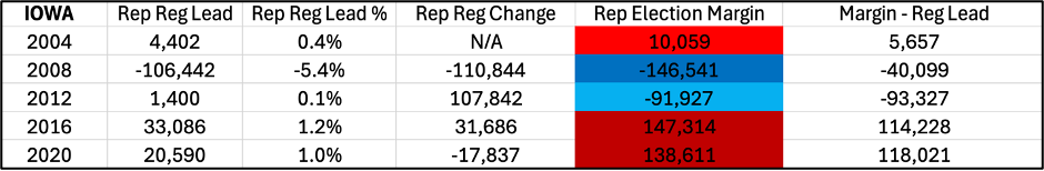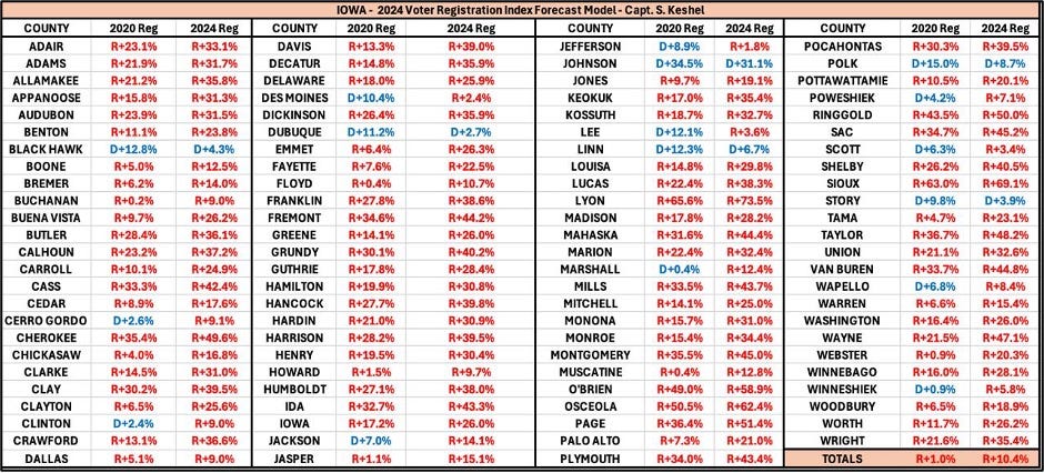 To believe Iowa is sailing left, let alone as far left as Selzer maintains, one would need to believe the active Democrat registration totals fell by over 203,000 and all 99 counties became more Republican or less Democrat as a share of registration. Voter registration has been perfectly predictive of all elections in Iowa this century: