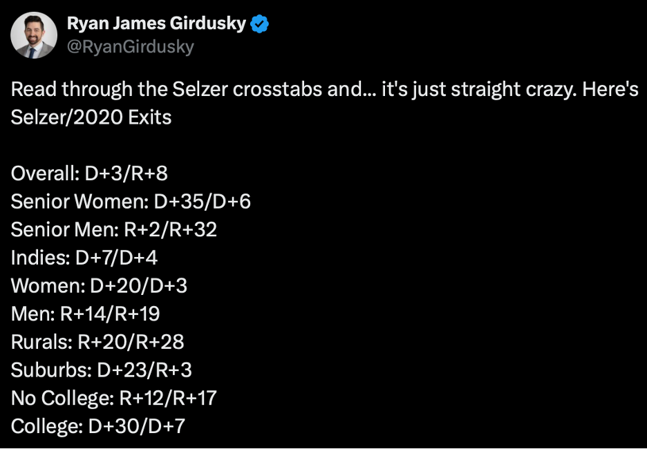 The methodology for the Iowa poll is atrocious. It sounds like she polled the Lincoln Project or a women’s psych ward, because “protecting our democracy” and “abortion” came well ahead of immigration and the economy as priority issues among those polled. The recall vote of the poll (who did you vote for in 2020?) was Biden +2, over ten points left of the Trump +8.2 result (meaning she pulled her answers from a group that backed Joe Biden by two points, not a group that backed Trump by a margin matching the state’s certified result - this would be like polling Massachusetts Republicans and assembling a poll of their answers suggesting the state would turn red), with D+3 used as party identification and not the current R+10.3. Ryan Girdusky gave some more details: