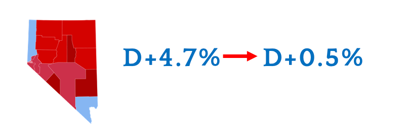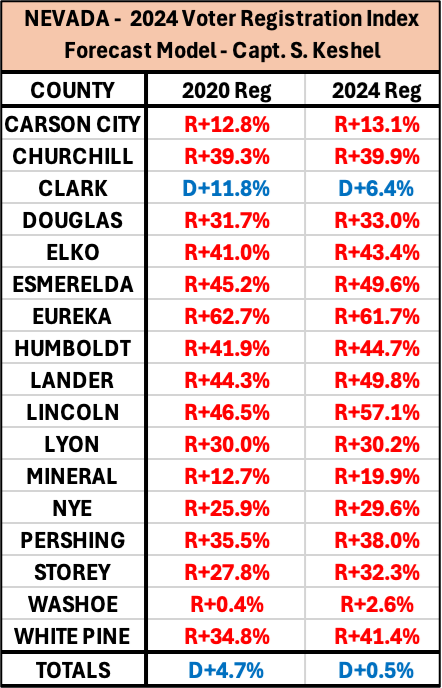 16 of 17 county equivalents in Nevada are shifted Republican since 2020, with Eureka County serving as a curious exception, but only thanks to the dilution caused by Automatic Voter Registration. Simply put, every county is on a MAGA swing, and now the vaunted Democrat firewall is in shambles. A recent voter roll purge decimated the Democrat voter registration edge in Clark County, and it is showing with each passing day.