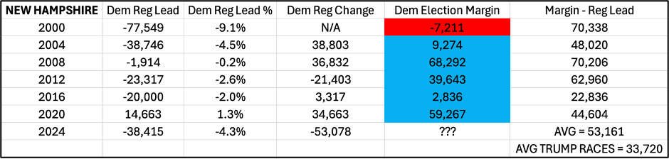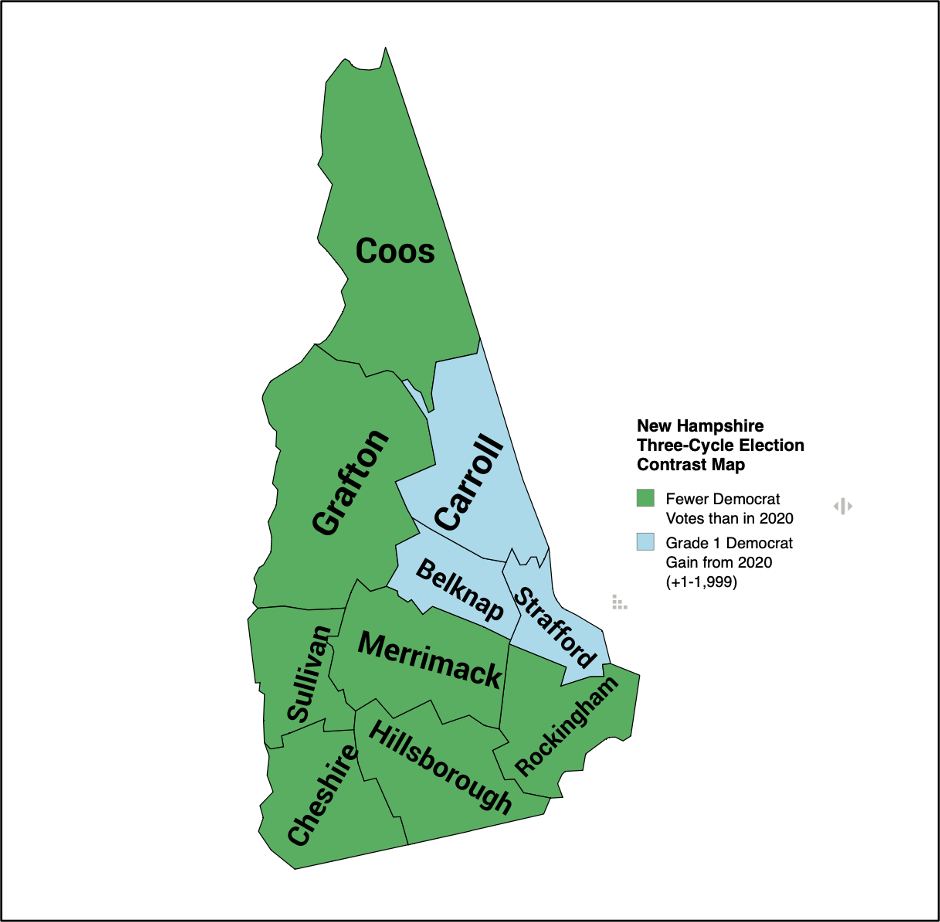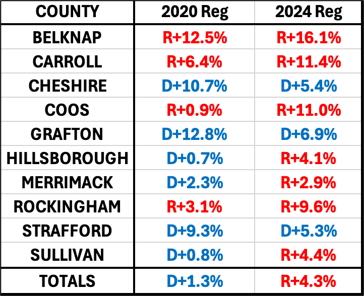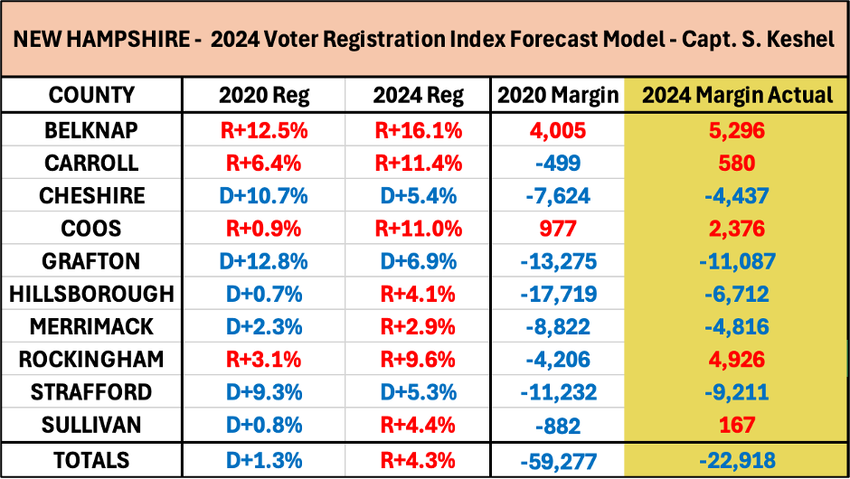 · Party registration shifts since 2020 (every county shifted toward the GOP) suggested Trump would improve in all 10 counties. The party registration indicator went 10 for 10 in New Hampshire, with margins in all 10 counties more favorable to Trump than in 2020.