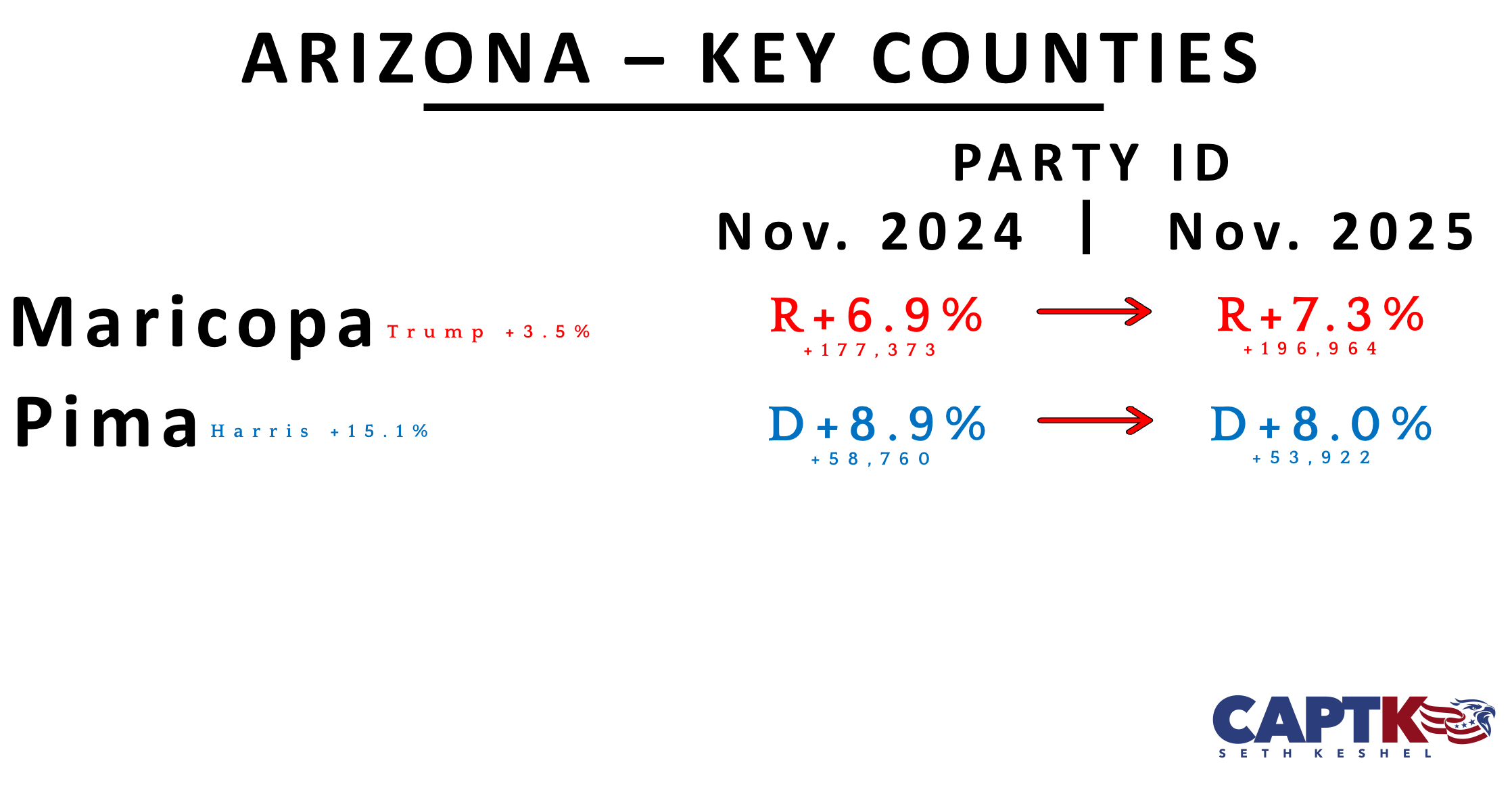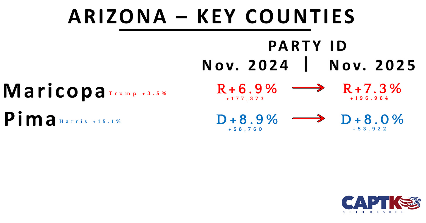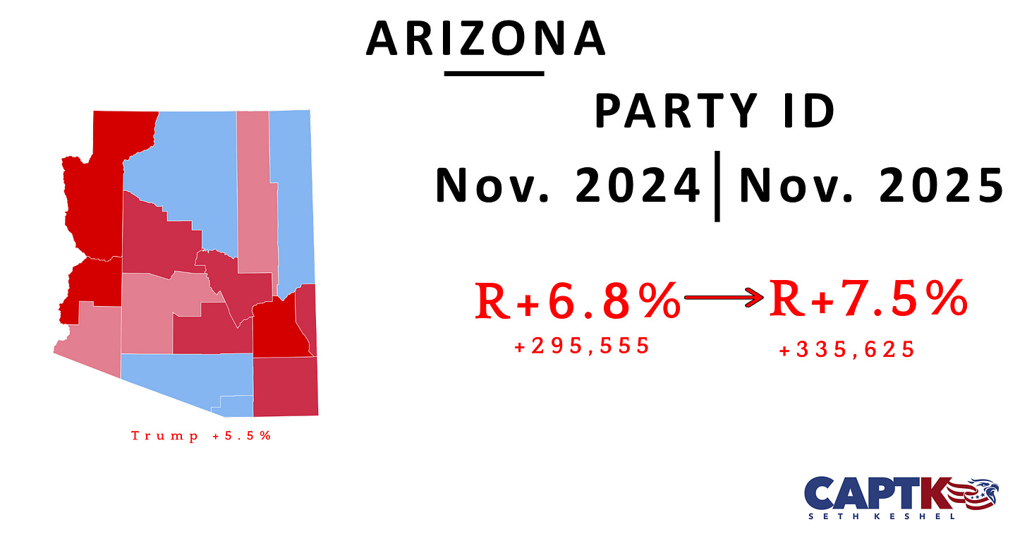 The Secretary of State posted updates from all counties in October, which contributed to the heavy Republican shift since the last report. Arizona Republicans have more than doubled their lead since the 2022 midterm debacle in the state. With the right governor, they could chart a course like Florida’s and establish a new western GOP stronghold.