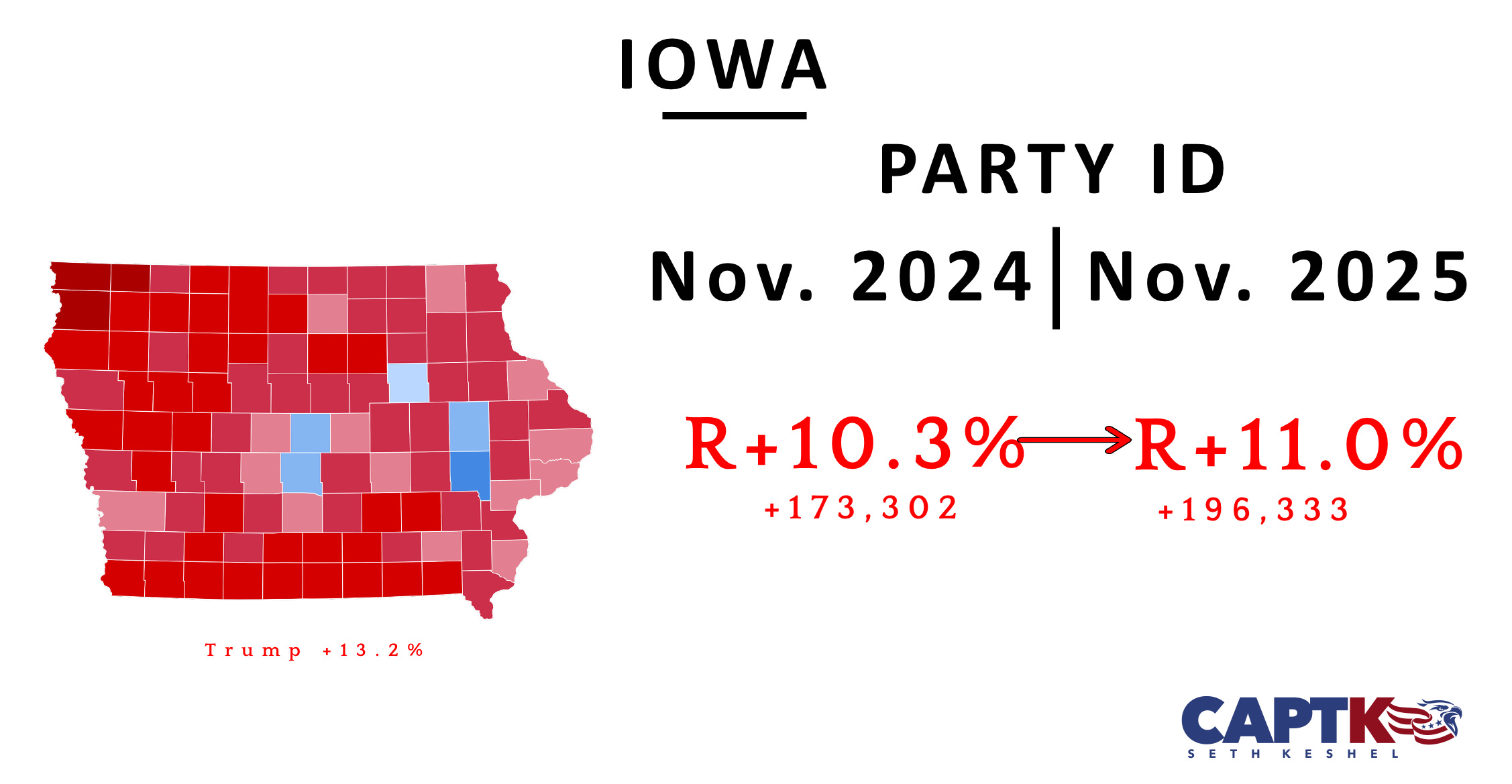 Iowa is more than 23,000 registrations redder than it was when Trump won the state by over 13 points in 2024. Minnesota and Wisconsin, which don’t register by party, typically shift with Iowa.