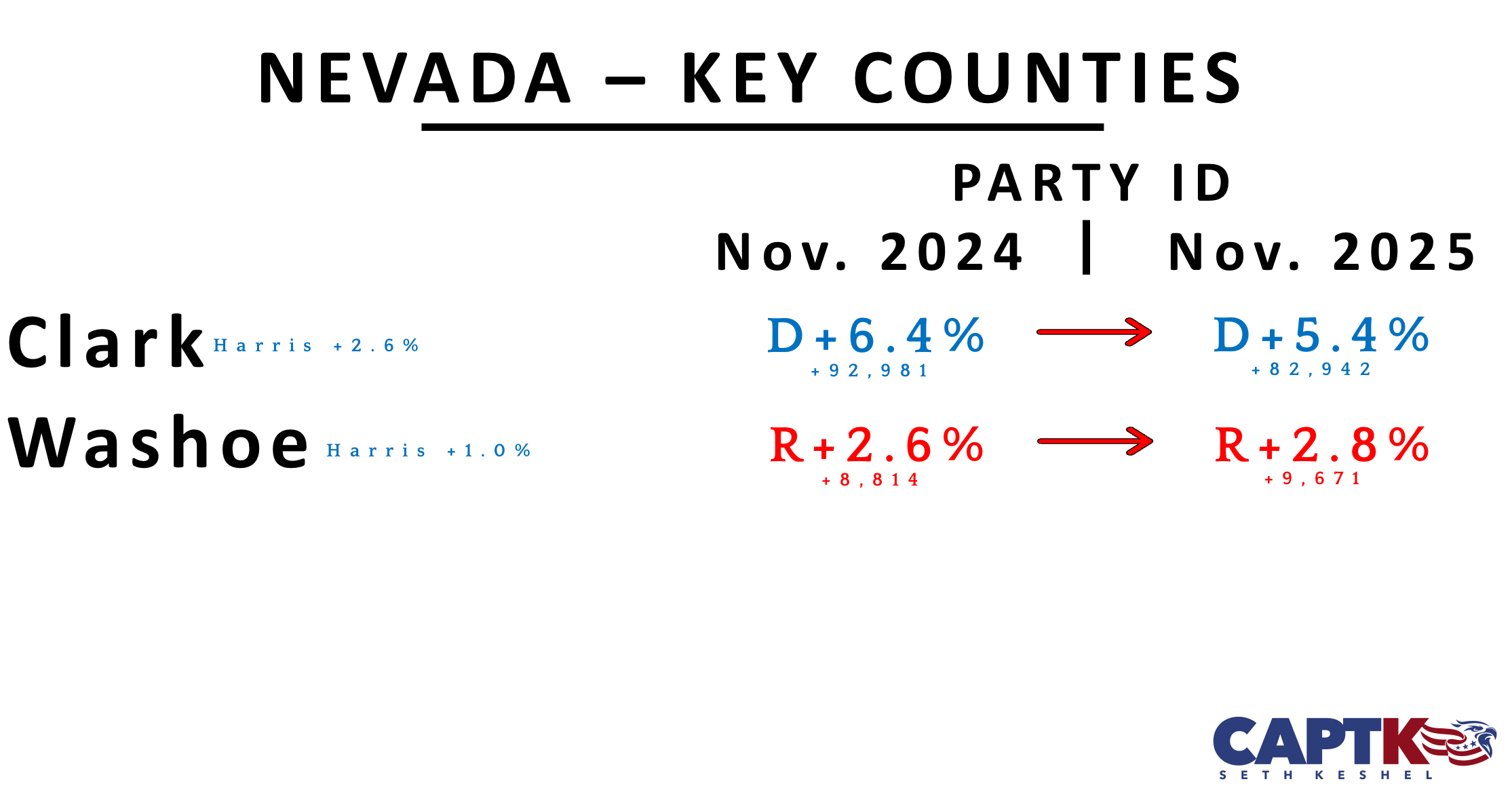 Nevada has voted to the right of its party registration for the past four presidential elections; last month, the GOP made small gains in Clark (metro Las Vegas) and Washoe (metro Reno) Counties, which were the only two counties Harris won in the 2024 election.