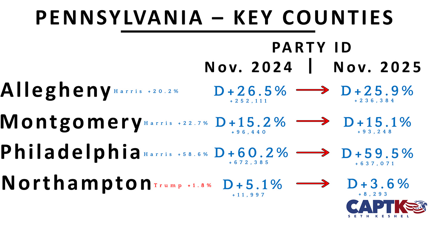 Despite a temporary shift left statewide, bellwethers Northampton and Erie Counties continue to show the same rightward lean - a positive sign the state’s long-term trajectory continues to favor the Trump coalition. John Fetterman’s public statements seemingly reflect this sentiment.