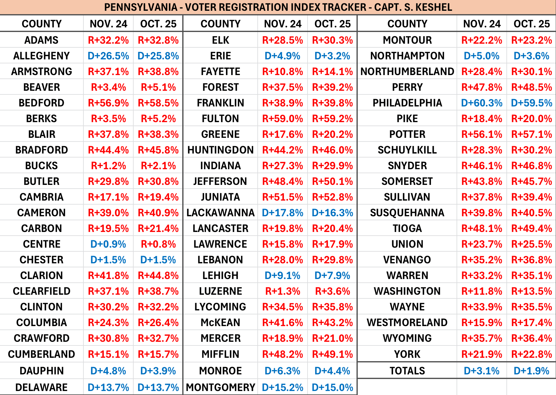 65 of 67 counties have shifted Republican (more Republican or less Democrat) since the 2024 election; Chester and Delaware are at the same marks and may begin to nudge left from here based on current traction.