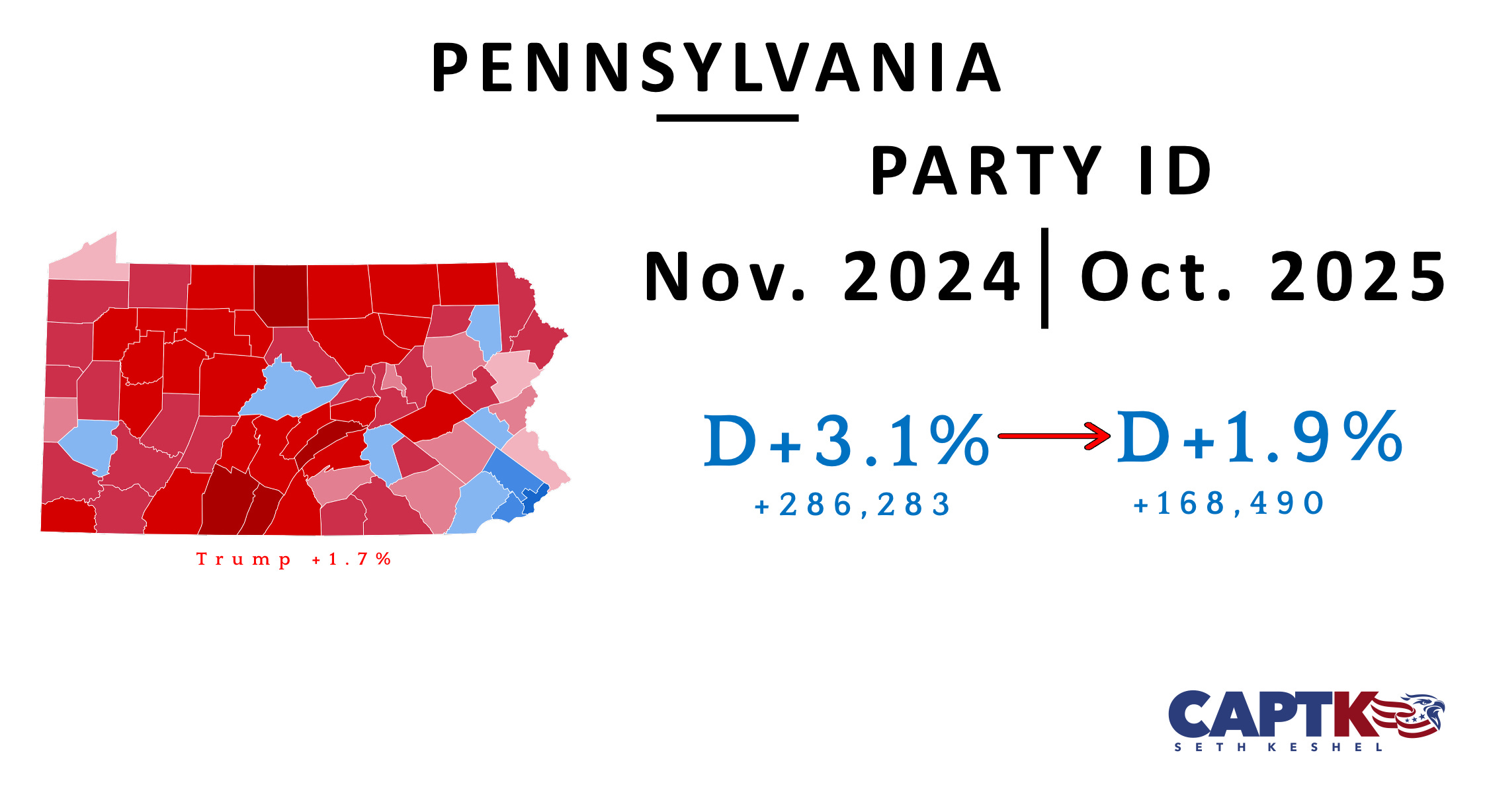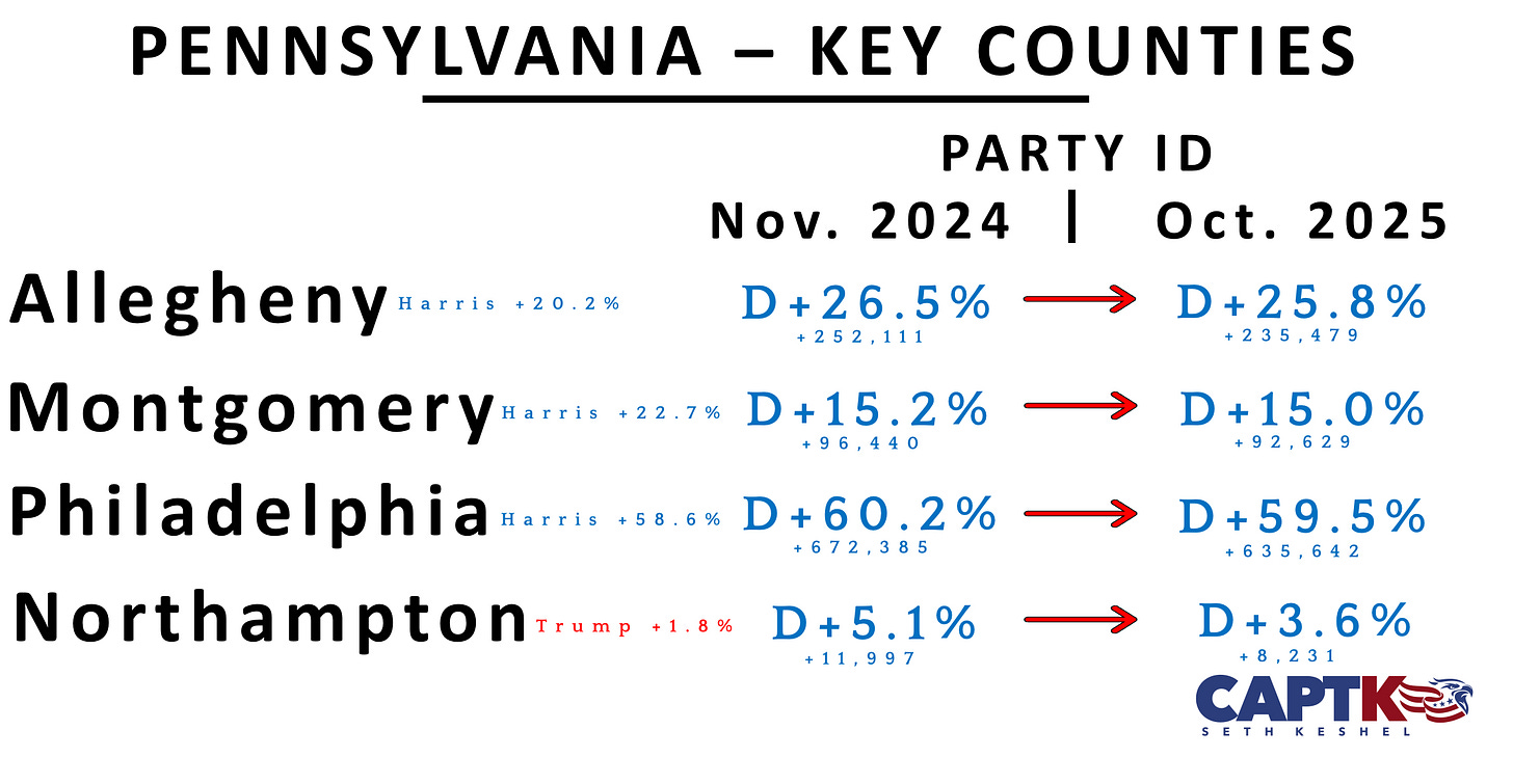 The key blue collar bellwethers, Erie and Northampton Counties, continue on a Republican trajectory after having been won by Trump in 2024. Erie has moved from D+4.9% to D+3.2%, and Northampton from D+5.0% to D+2.6%.