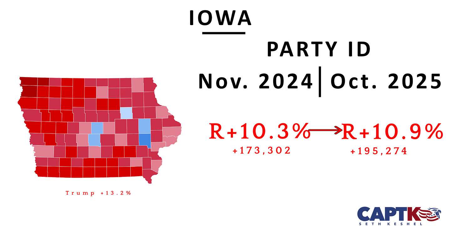 Iowa is nearly 22,000 registrations redder than it was when Trump won the state by over 13 points in 2024. Minnesota and Wisconsin, which don’t register by party, typically shift with Iowa.