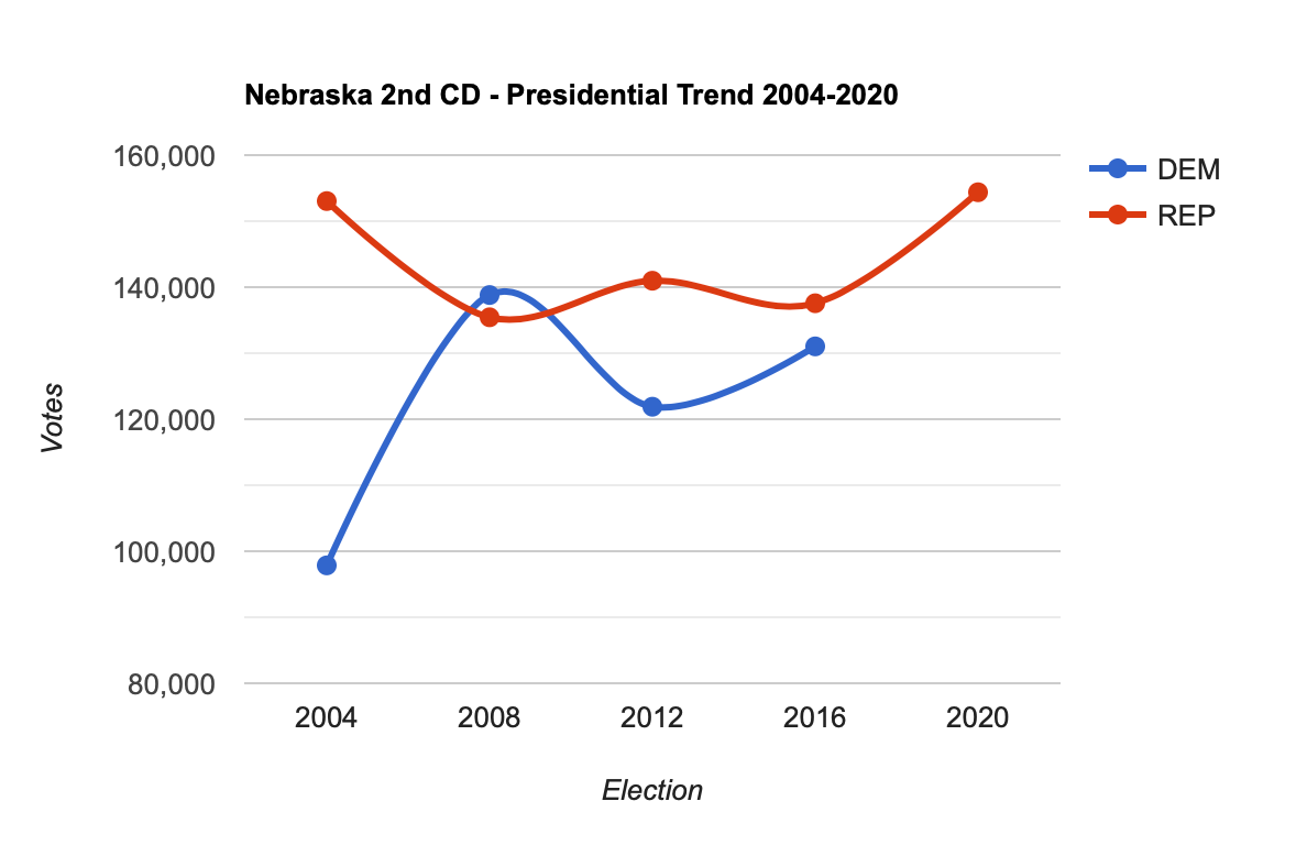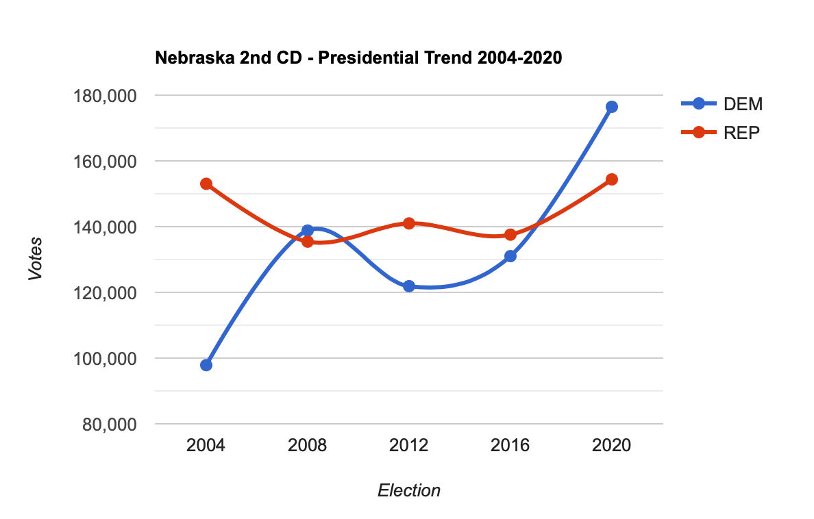 Maine’s electors had been all Democrat since 1992, until Trump flipped the second congressional district (ME-2) in 2016, and held onto it in 2020, despite serious attempts to deprive him of that single electoral vote. Nebraska’s electors are usually all Republican, though its second congressional district (NE-2), made up of Sarpy County and most of Douglas County (metro Omaha), did give its lone elector to Barack Obama in 2008 in an upset.
