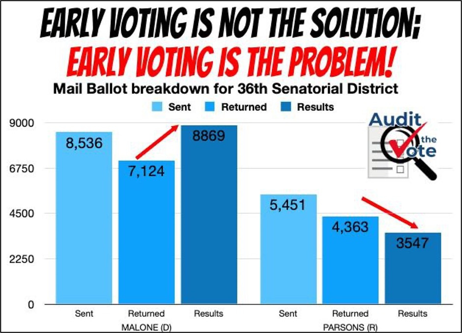So, Malone took mail ballots by 42.3% when factoring in those that went to the libertarian candidate, or by a margin 482 bigger than Parsons won day-of voting. This is despite mail-in balloting representing less than a quarter of the vote overall.