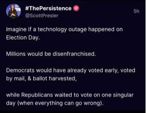 With yesterday’s national IT snafu making talk of the Vance selection and even Trump’s survived assassination attempt seem like old news, a lingering conversation has again poked its way out of the recesses of the mind and into full view. It centers on Scott Presler and his efforts to get as many Republicans as possible not only registered, but to vote by mail and vote early. Every time there is an incident like yesterday’s, especially the deliberate sabotage of voting machines greenlighted by Maricopa County in the 2022 midterms, people come to the loudest election integrity truthers and ask if it’s still a good idea to wait until Election Day to vote in person when there are so many documented and potential hazards that may prevent one from registering said vote. Here is Presler driving his point home yesterday as to why Republicans need to vote early and/or vote by mail: