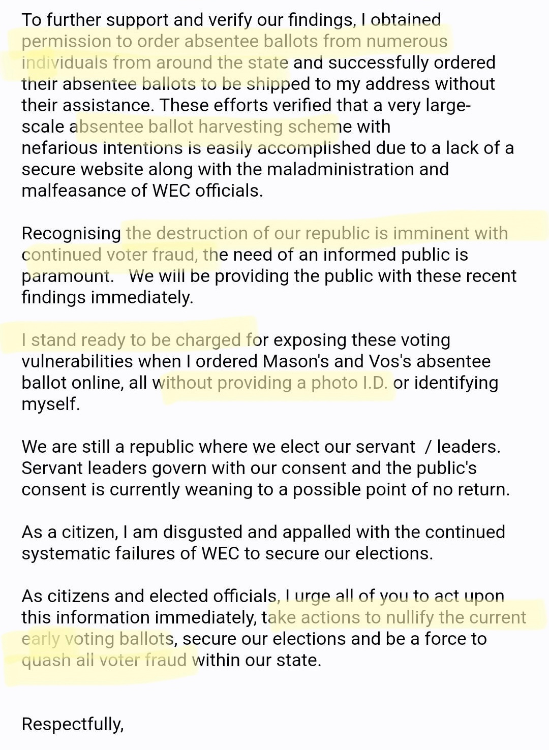 Enter Harry Wait. He just did what any patriot would do, and straight up requested Vos’s ballot by mail, with no ID required, and had it sent to his own address. Talk about crafty - I think the history books may record this as a one-up for all time.