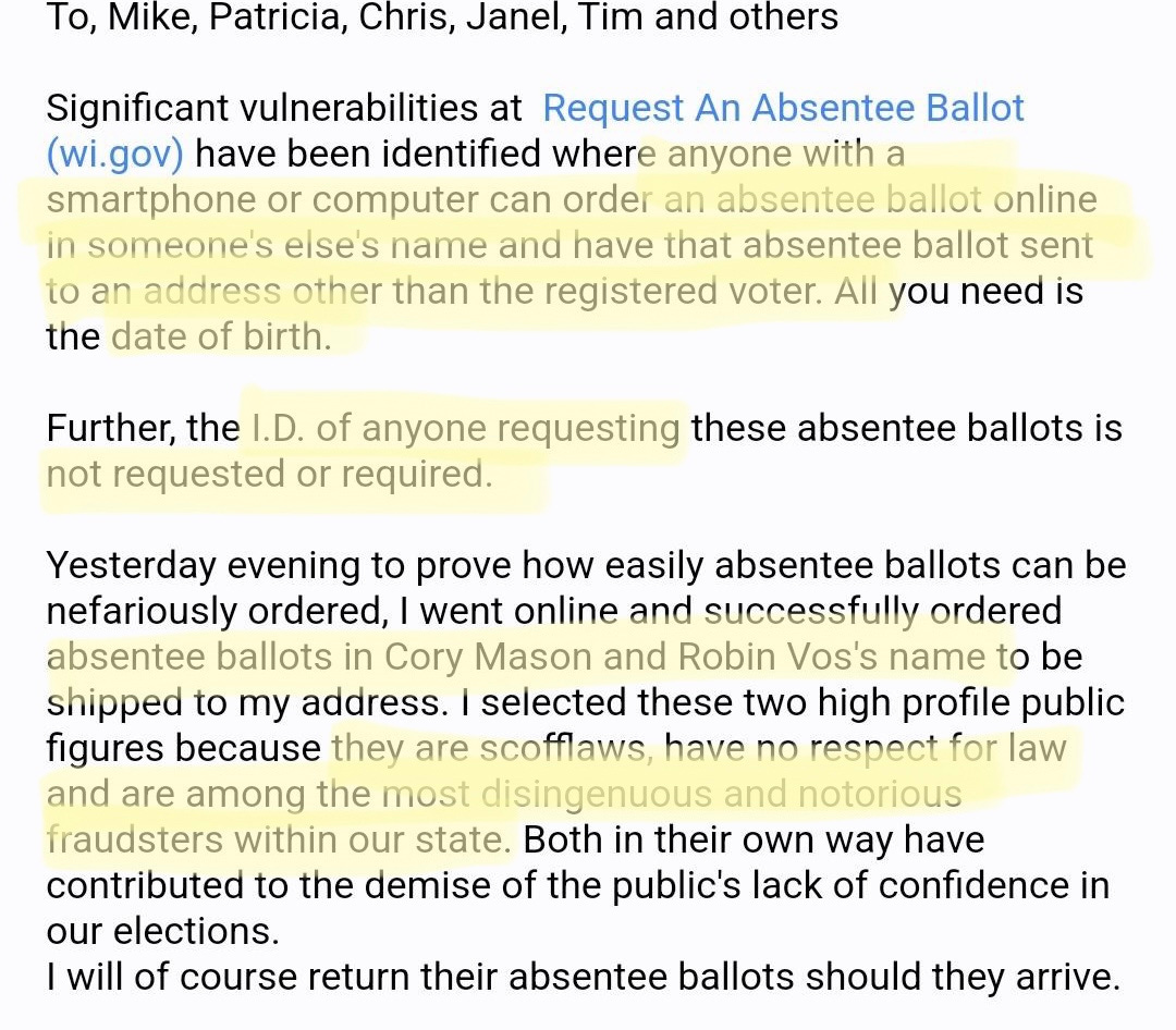 Wisconsin’s mail balloting system is so porous and out of control that anyone with someone else’s date of birth can order that person’s ballot and have it sent anywhere.