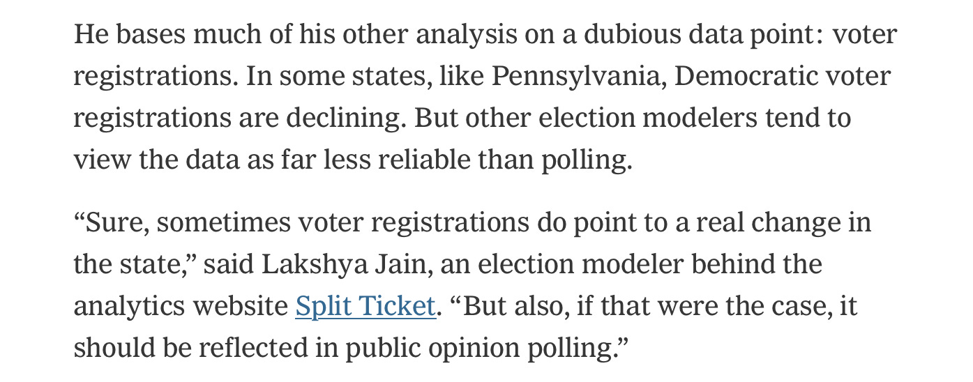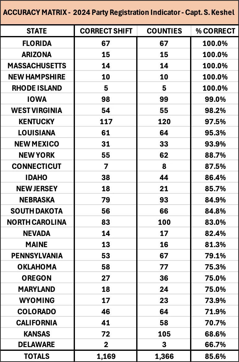 Fact Check: Every state that had a Republican voter registration lean from the 2020 election moved to the right in the 2024 election. The only state with a Democrat registration lean from the 2020 election (Colorado at .05% left of 2020), moved 2.5% to the right, making it the only technical miss, and one that favored Trump. Voter registration by party remains the king of presidential forecasting. Ask Ann Selzer how going against the grain on it worked out for her career.