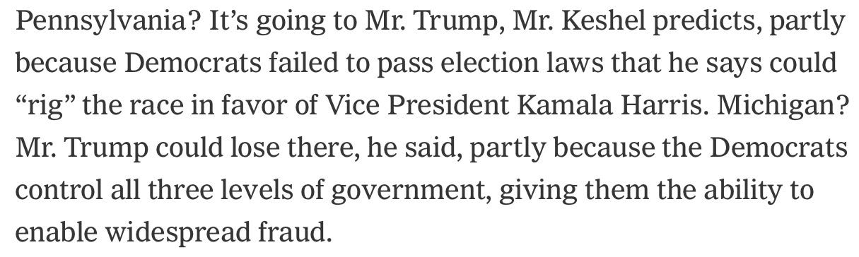 I predicted Pennsylvania wouldn’t be able to replicate its 2020 cheat, primarily because Automatic Voter Registration didn’t get started until the end of 2023 when Josh Shapiro ordered it by fiat. Michigan, like Georgia, are pegged by the NYT as possible “losses,” primarily because I considered them possible steals thanks to the terrible election laws, like Automatic Voter Registration, and dominant, corrupt urban hubs. My final predictions had Trump carrying both. I was also one of the only voices out there suggesting New Hampshire would be close, and I was right.