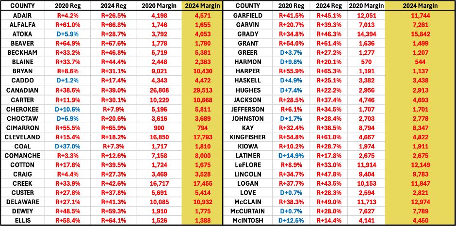 · Oklahoma from R+16.8% in 2020 to R+25.3% in 2024