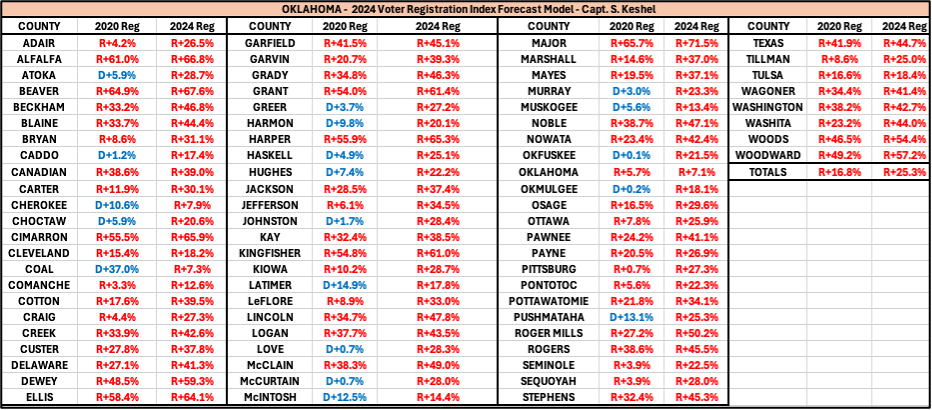 · 58 of 77 counties in Oklahoma became more Republican as a percentage margin of victory for Trump, meaning the registration index was 75.3% accurate as a predictor for county trajectory by percentage margin. Trump won only 50 of 77 counties by a higher raw vote margin than he did in 2020. See county results below: