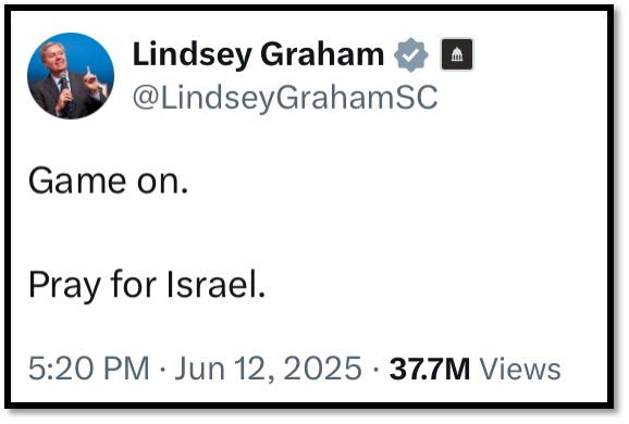 War is not a game, Senator Graham. War is an occasional and evil necessity of a fallen world, and not necessarily necessary in every case that can be drummed up by those who stand to profit from the conflict itself, or the vacuums to come as the conflict wanes. This is not to say that supporters of Iran, or supporters of Israel, or the citizens therein, may not find themselves in support of an extended conflict (remember, the Iran-Iraq war lasted for 8 years) in which they must fight (and are compelled by government to do so), but this does not and should not force the hand of the American Commander-in-Chief to commit American sons and daughters to the fight.