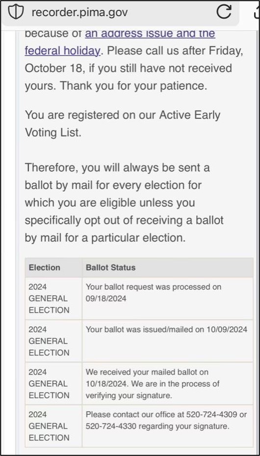 Signature? What signature? You mean someone placed a signature on a ballot they made no selections on, and returned it to the county? Remember, the fundamental issue with elections in America exists because of the major distrust brought about by a lack of government transparency. Do you mean to tell me a county as large as Pima County that considers itself capable of maintaining a list of hundreds of thousands of early mail-in voters can’t create enough categories to outline any updates or issues regarding returned with a signature?