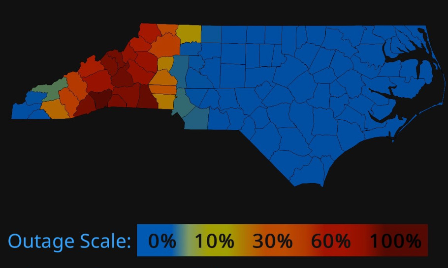 The above map, from poweroutage.us, provides running estimates of how many households or facilities are without power, and that is current as of yesterday morning. I used it to create an arbitrary map with three grades of severity, shown below: