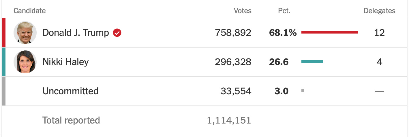 What this means is, Republican primary voters (all 2,030 of them) in Washington, D.C., voted 71 points moreHaley than voters in Michigan did (the difference between Trump’s victory margin in Michigan and his deficit in Washington, D.C.). Michigan runs on diesel, automobile manufacturing, farming, factories, and tourism, benefitting the work man and his family. Washington, D.C., runs on war, unmitigated crises, smoky backroom deals, lobbying, and selling out American citizens, benefitting the most corrupt, problem-perpetuating people in the world today. Still, surprisingly, a third of what amounts to mostly professional Republicans and Beltway bureaucrats smell a Trump victory on the horizon that will rain down administrative jobs throughout the capital.