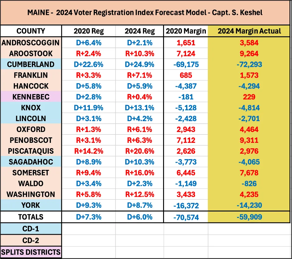 Democrats have mastered ballot harvesting in Maine, and that (aided by Automatic Voter Registration) is the only reason they pried away the ME-2 House seat by an eyelash when Trump won the district by almost 10 points. Trump had 3,002 more votes than Hillary Clinton won the state with in 2016 in a losing effort in 2020, and 20,242 more than Clinton in 2024, yet lost the state by 6.9% to Kamala Harris.
