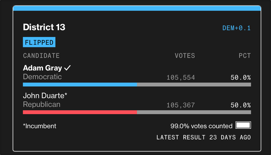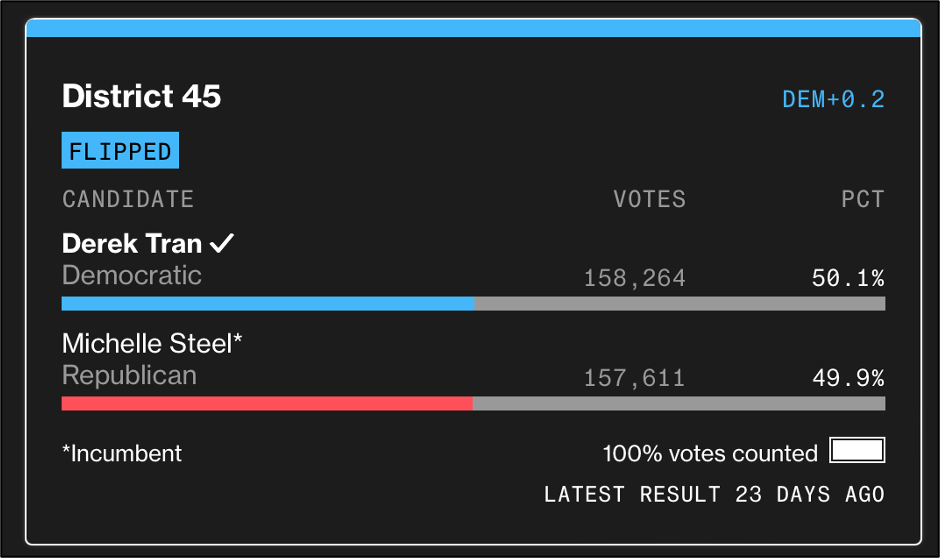 · In CA-45, located just south of Los Angeles, Republican incumbent Michelle Steel suffered the same cruel December fate as Duarte, losing her seat by 653 ballots (0.2%) out of more than 300,000 counted to Democrat Derek Tran. Incredibly, despite being certain of victory, Steel conceded a third world race: