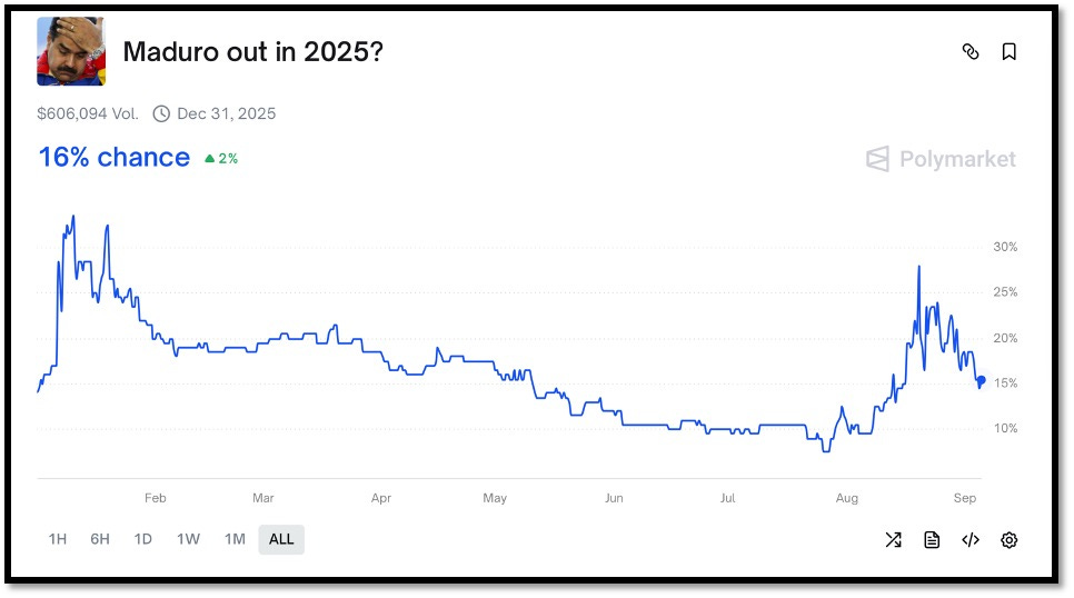 Polymarket takes on a lot of opinions from forecasters (including mine last fall before the election), and they are hosting tons of markets about possible military action or regime change in Venezuela. Personally, I believe there is a much higher chance for Maduro to be ousted in 2025 than the current 16% odds, especially now that most of the world called him out on his Chicago-style election rigging. President Trump’s words describing the Tren de Aragua gang, which is also well known to the citizens of Aurora, Colorado, leave nothing to the imagination: