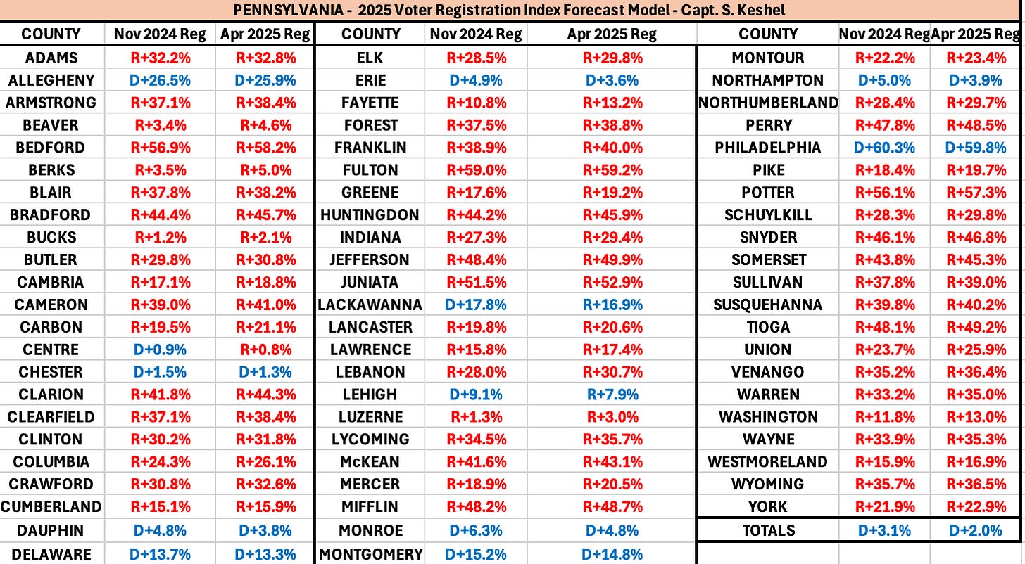 The key areas of Pennsylvania that shifted from blue dog to Trump or die continue to show the same characteristics, and I won’t worry about Pennsylvania until that stalls out. In all likelihood, once primaries are over this month, we will resume the Pennsylvania GOP shift. As you can see before this week’s update, all 67 counties have shifted rightward since November 2024 in a state that is thinking about becoming a GOP-plurality state by the time J.D. Vance takes a shot at it in 2028: