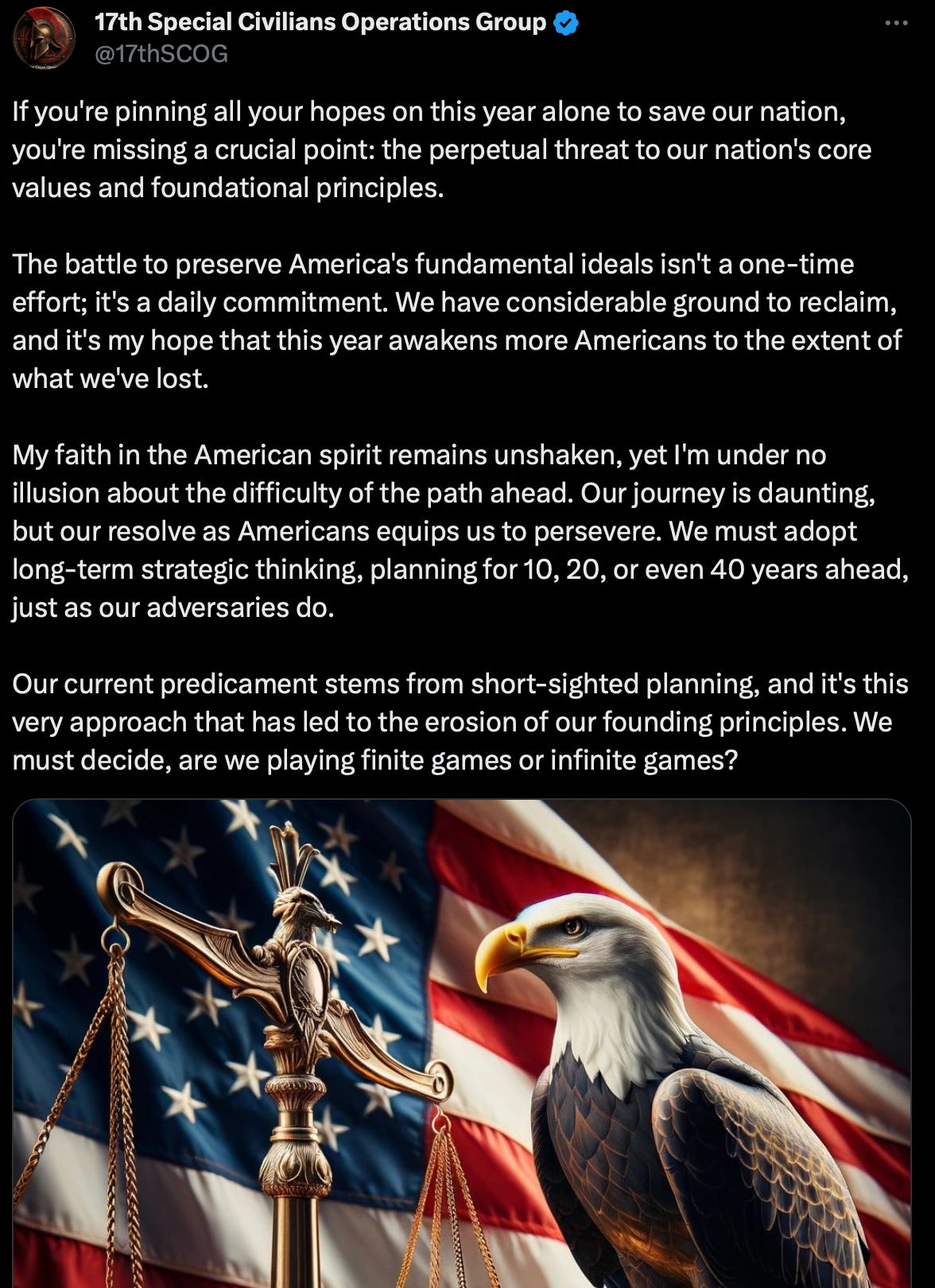 Looking for progress in the day to day is a surefire way to burn out and drive yourself to legitimate anxiety, insanity, poor health, and unhappiness. Instead, this X post by the 17th Special Civilians Operations Group hits the nail on the head for me.