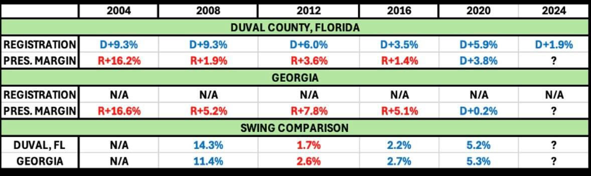 Duval County, Florida, the home of metro Jacksonville, is the most important county to watch in the Sunshine State if we are looking to read tea leaves for a decisive electoral college state. It mirrors Georgia perfectly since 2004 and has almost identical racial, ethnic, and socioeconomic demographics. Duval has shifted 4 points to the right in its registration index (from D+5.9% in 2020 to D+1.9% today) and is currently turning out at R+3.5% as of the time of this writing.