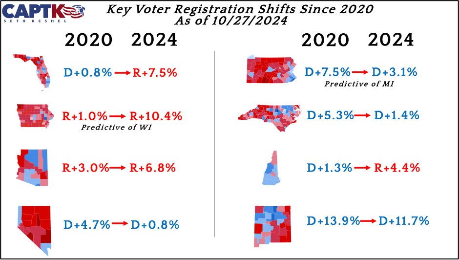 30 of 31 states that register voters by party have become either more Republican or less Democrat than they were at the time of the 2020 election, with Colorado being the only state drifting left. Five of eight key battleground states are also substantially more Republican (or less Democrat) than they were in 2020 – Nevada, Arizona, North Carolina, Pennsylvania, and New Hampshire. Two peripheral states registering by party that can be used to peg battlegrounds that don’t are also much more Republican than they were in 2020 – Florida and Iowa. Pennsylvania is the most striking of all states with this metric, boasting 64 of 67 counties shifting Republican since 2020, with a net change to the voter roll favoring the GOP by more than 400,000.